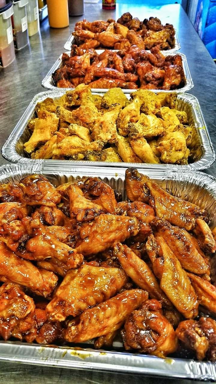 BBQ wings, Garlic wings, Buffalo wings, Buffalo Cauliflower, Carrots and Celery, Steak Fries And Coleslaw Salad