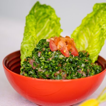 Parsley, tomatoes, cracked wheat, mint, olive oil and lemon juice.